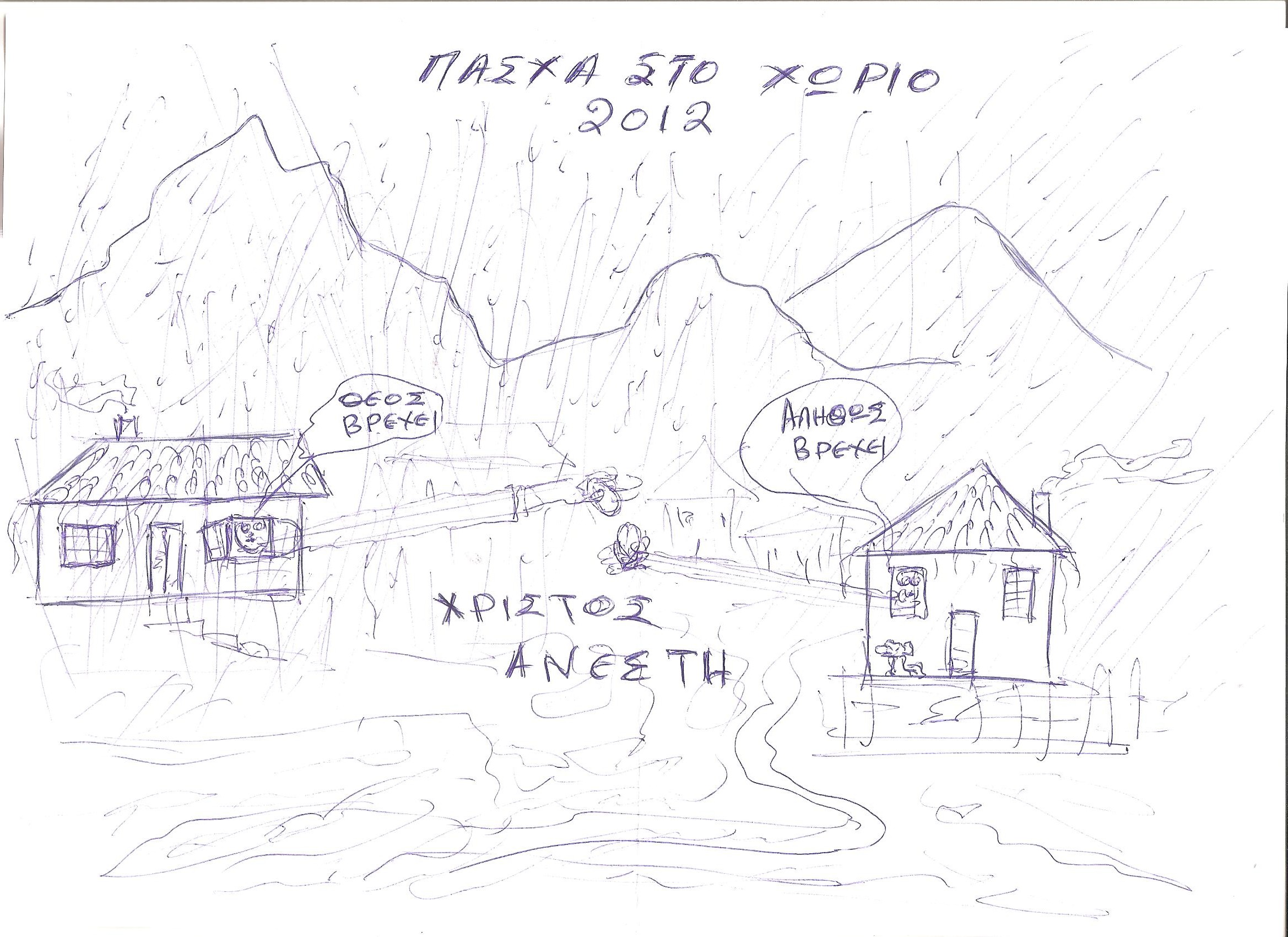 Η φετινή έξοδος των Αθηναίων στην επαρχία για το ΠΑΣΧΑ βγήκε ξινή για τούς περισσότερους. Η συνεχής βροχή ήταν τέτοιο φαινόμενο φέτος, που σε πολλές περιπτώσεις όπως στα δικά μας τα χωριά ήταν να αναφωνείς, Νισάφι πια.