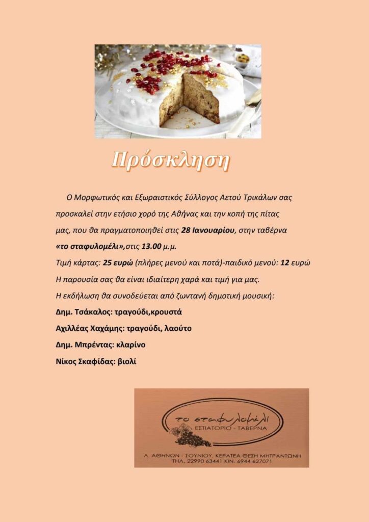 Με μεγάλη μας ανυπομονησία σας προσκαλούμε στήν ετήσιο χορό του συλλόγου και στην κοπή της πίτας μας , που θα πραγματοποιηθεί στις 28 Ιανουαρίου, στην ταβέρνα “το σταφυλόμελι” στις 13.00 το μεσημέρι.