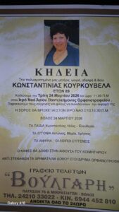 Με λύπη σας πληροφορούμε τον χαμό της Κωνσταντινιάς Κουρκουβέλα, κόρη του Ηλία και της Ευαγγελίας Τσιακοβή.