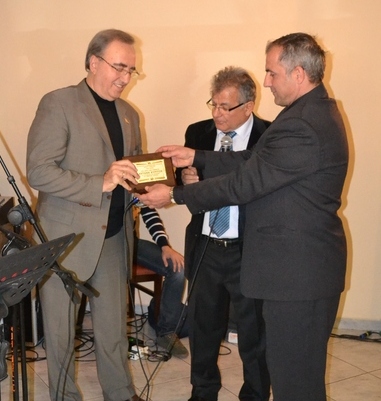 Ο πρόεδρος Παντελής Τσάκαλος και ο γραμματέας Νίκος Λ. Καρανάσιος βραβεύουν τον Αντώνη Κυρίτση.