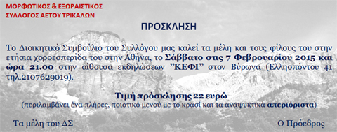 Ο πρόεδρος Ηλίας Ν. Τσάκαλος και τα υπόλοιπα μέλη του Δ.Σ. καλούν όλους τους Αετιώτες αλλά και τους φίλους του Συλλόγου στον ετήσιο χορό του στην Αθήνα, αυτό το Σάββατο(7/2) στις 9μμ στην αίθουσα εκδηλώσεων “Κέφι” (Ελλησπόντου 41 στον Βύρωνα).